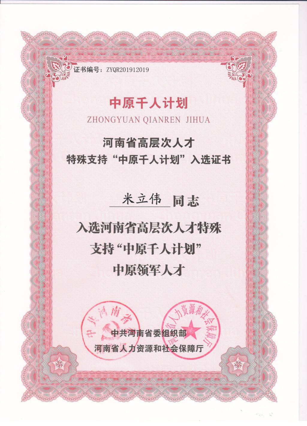 日前,中共河南省委组织部与河南省人力资源和社会保障厅联合发文,公布了2019年度河南省高层次人才特殊支持“中原千人计划”入选人员名单。材料与化工学院院长米立伟教授入选2019年度中原千人计划--中原科技创新领军人才。