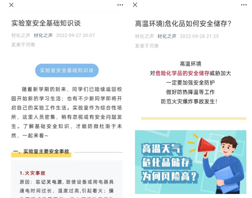 借助材料与化工学院认证公众号材化之声作为学院实验室安全宣传网上教育交流的主要平台,发布安全知识,利用学生喜闻乐见的方式让安全深入人心。