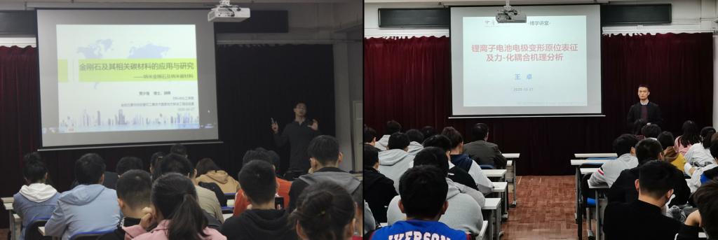 贾少培老师对材科17级同学作了题目为《金刚石及其相关碳材料的应用与研究》的讲座。贾老师首先对材料科学进行了概述,并再三强调其在生活生产中的重要性。然后从物质层次、研究方式、操控及历史三个方面讲述了如何研究材料。随后对金刚石涂层研究展开了较为详细的解读,涂层技术研究不仅可以提高工作效率和生活品质,而且能够产生巨大的经济社会效益。最后,贾老师针对纳米碳材料在能源领域的应用、金刚石的应用效果、研究瓶颈以及目前研究的主要方向和工作进行了阐述。接着王卓老师对材科18级同学作了《锂离子电池电极变形原位表征及力-化耦合机理分析》的讲座。王老师详细介绍了锂离子电池的研究背景、基于数字图像的相关技术电池电极变形原位表征,以及如何对层状电极电-化热耦合模型进行分析。在讲座的结尾,贾老师和王老师均增加了提问与问答的环节,对同学们提出的问题一一解惑。