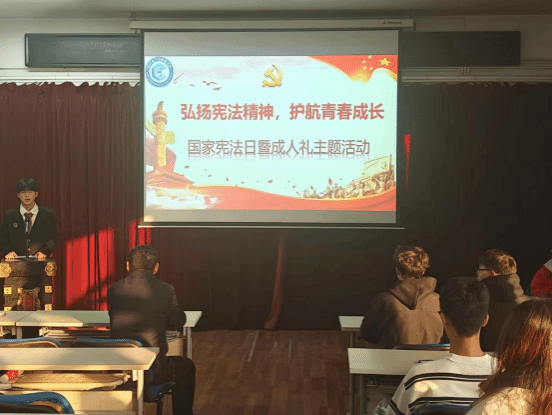 国家宪法日暨成人礼主题活动在雄壮的国歌声中拉开帷幕。李长林以《弘扬宪法精神 不负青春韶华》为题,深入浅出、生动形象地介绍了宪法的历史,宪法的特征和原则,我国的国家制度,公民的权利和义务等。他勉励同学们要培养感恩之心,认清自身责任,敢于拼搏奋斗,自觉尊法学法守法用法,用奋斗浇灌青春之花,用青春承担时代重任。