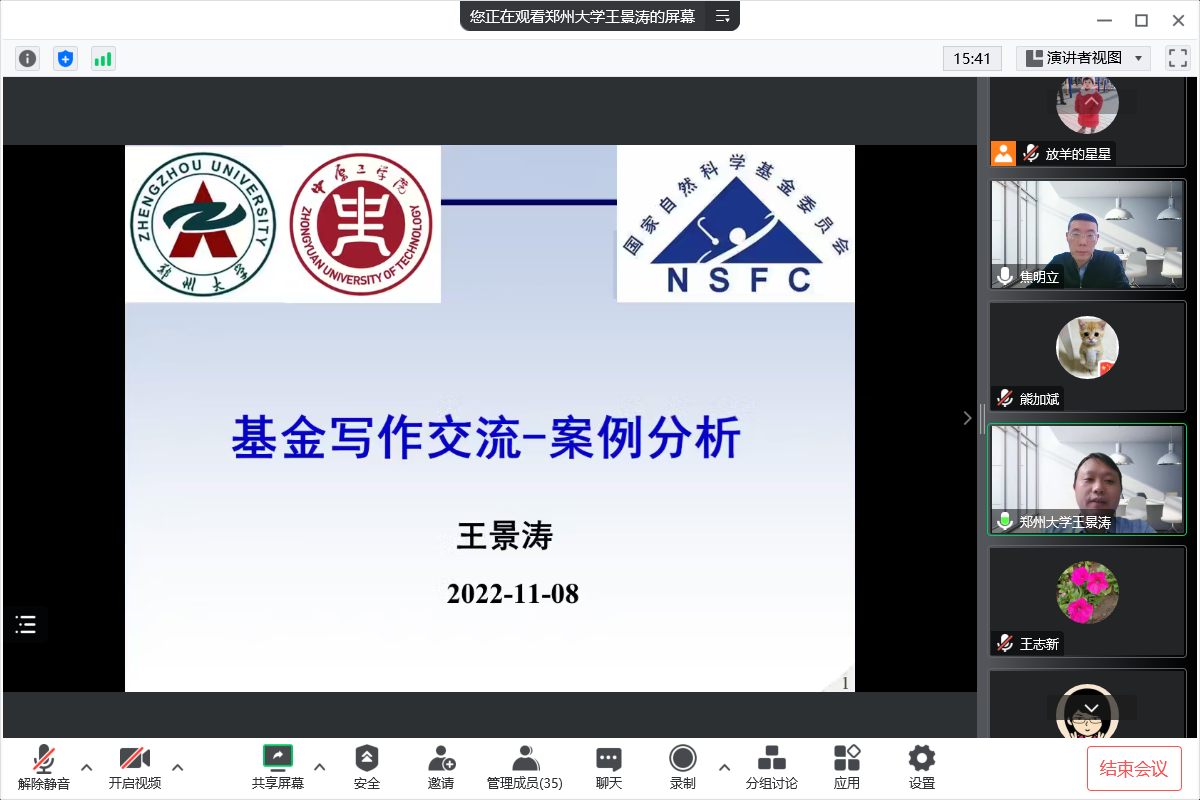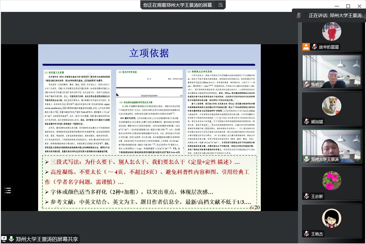 2022年11月8号下午,应我校科技处、材料与化工学院和先进材料研究中心邀请,郑州大学化工学院教授、博士生导师王景涛教授在腾讯会议上作了题为“国家自然科学基金写作——案例分析”的学术报告。报告会由材料与化工学院副院长焦明立教授主持,材料与化工学院、先进材料研究中心及其他院部百余名师生聆听了本次报告。