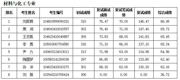 按照学校研究生招生工作安排,材料与化工学院2023年硕士研究生复试工作(第三批调剂考生)于4月12日进行,根据复试情况,现对考生综合成绩进行公示: