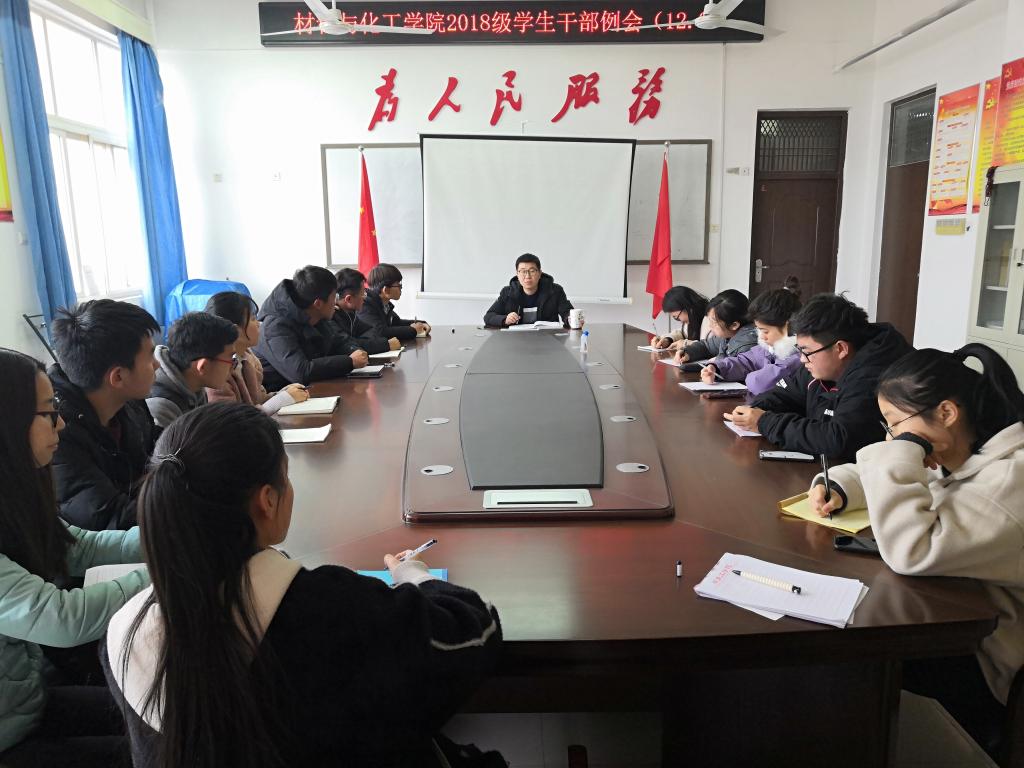 12月6日中午十二点四十,我院在二号实验楼526会议室召开学生干部会议。18级年级干部及各班班长团支书参加,会议由18级辅导员邢军阳老师主持。