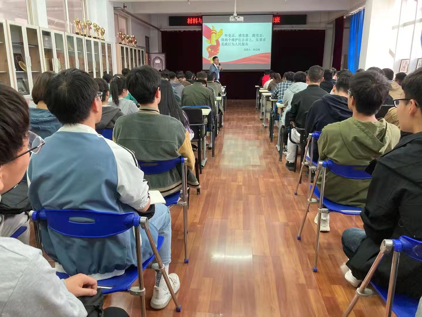 4月28日,按照材料与化工学院党委的部署,在2号实验楼543举行了“听党话,感党恩,跟党走,将‘两个维护’扛在肩上,实事求是践行为人民服务”的党课学习交流活动。本次党课分享交流由材料与化工学院院长米立伟教授作为分享人,学院辅导员、学生干部、入党积极分子等一百余名师生与会聆听。