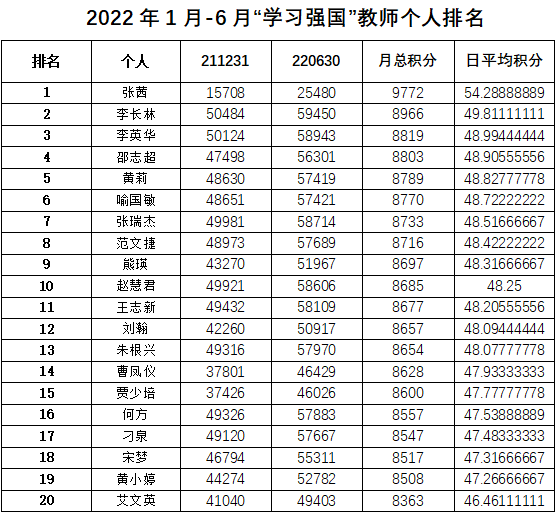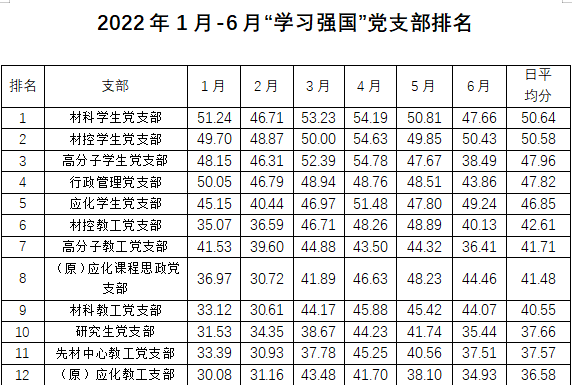 材料与化工学院各党支部上半年“学习强国”排名情况